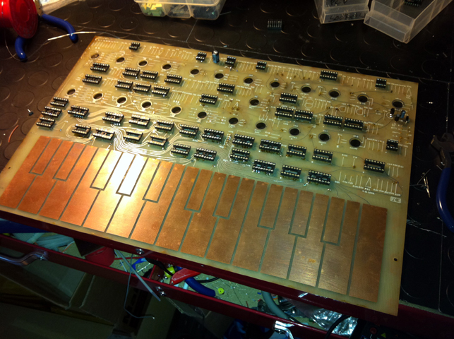 Here I have just completed the mammoth task of soldering all the IC footprints with sockets. I was forced into using turned pin sockets as they are best if you have pads on both sides of the board and no through hole plating. I will check that the power supply (also soldered in the photo above) is reaching all IC’s then I will proceed to bring each section up and running starting at the Keyboard scanning ending with the speaker amp.