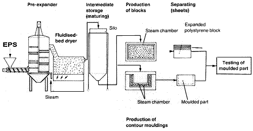 EPS is produced in a three stage process. In the first stage, polystyrene beads are expanded to between 40 and 50 times their original volume by heating to about 100ºC with steam in an enclosed vessel called a pre expander. During this process the beads are stirred continuously. In this process the final density of EPS is determined. This is typically between 14 kg per cubic metre and 30 kg per cubic metre. After pre expansion, the expanded beads are cooled and dried in a fluidised bed drier, before being pneumatically conveyed to storage silos for maturing.