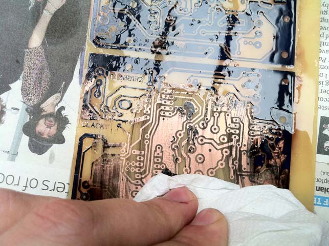 When all the acid is gone, pick up the board with paper towel and rinse it under the tap. Rinse it thoroughly until all the acid is gone, be careful of your kitchen sink! anything metal can be tarnished with this stuff!