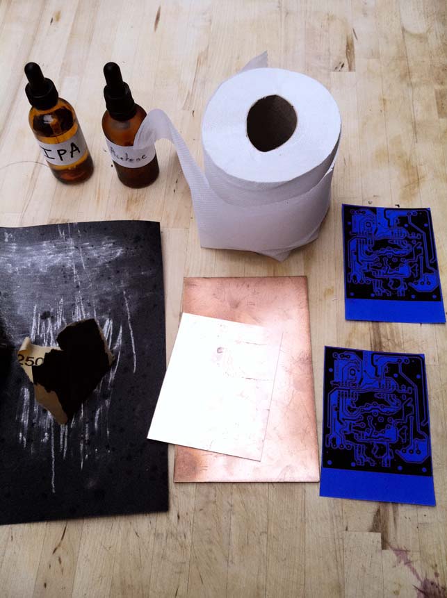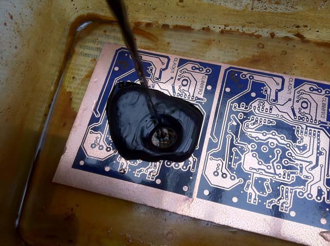 To etch all you need is some etchant, a big enough Tupperware box with steep sides and a container for the liquid. The most common etchant is ferric chloride, the good thing about it is that it lasts a very long time once you mix it up and it is cheap! The downside is that it is extremely staining and very dark so it can be hard to see your board. It is not a dangerous chemical as long as you dont bath in it or throw it in your eyes!